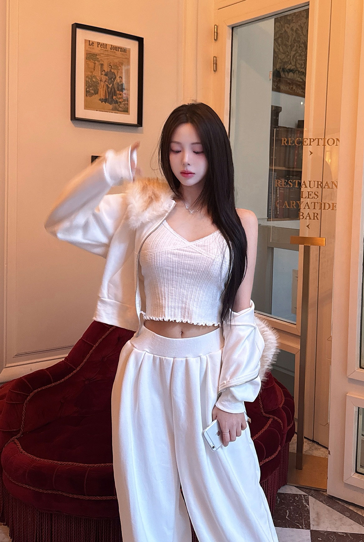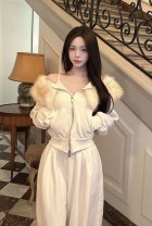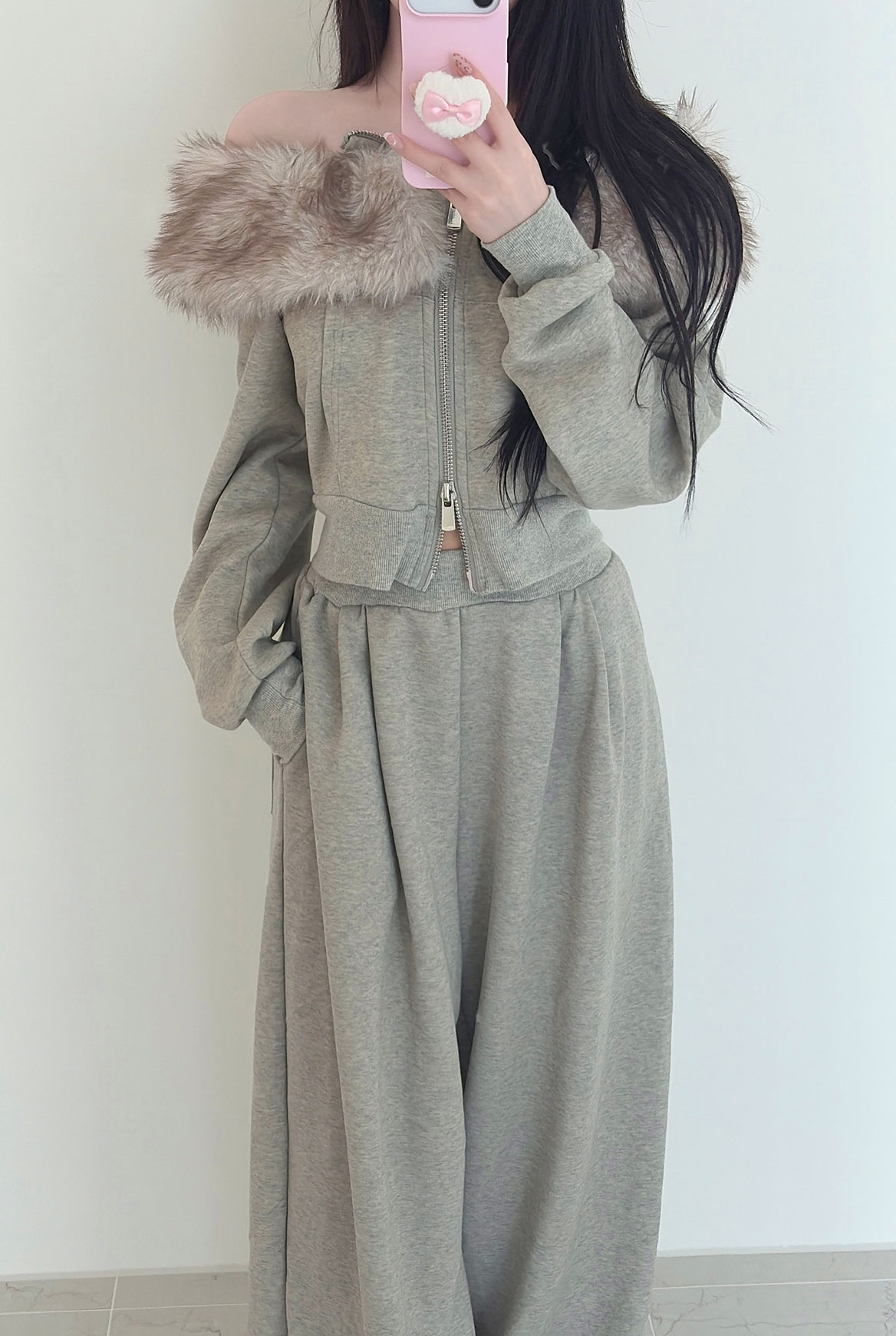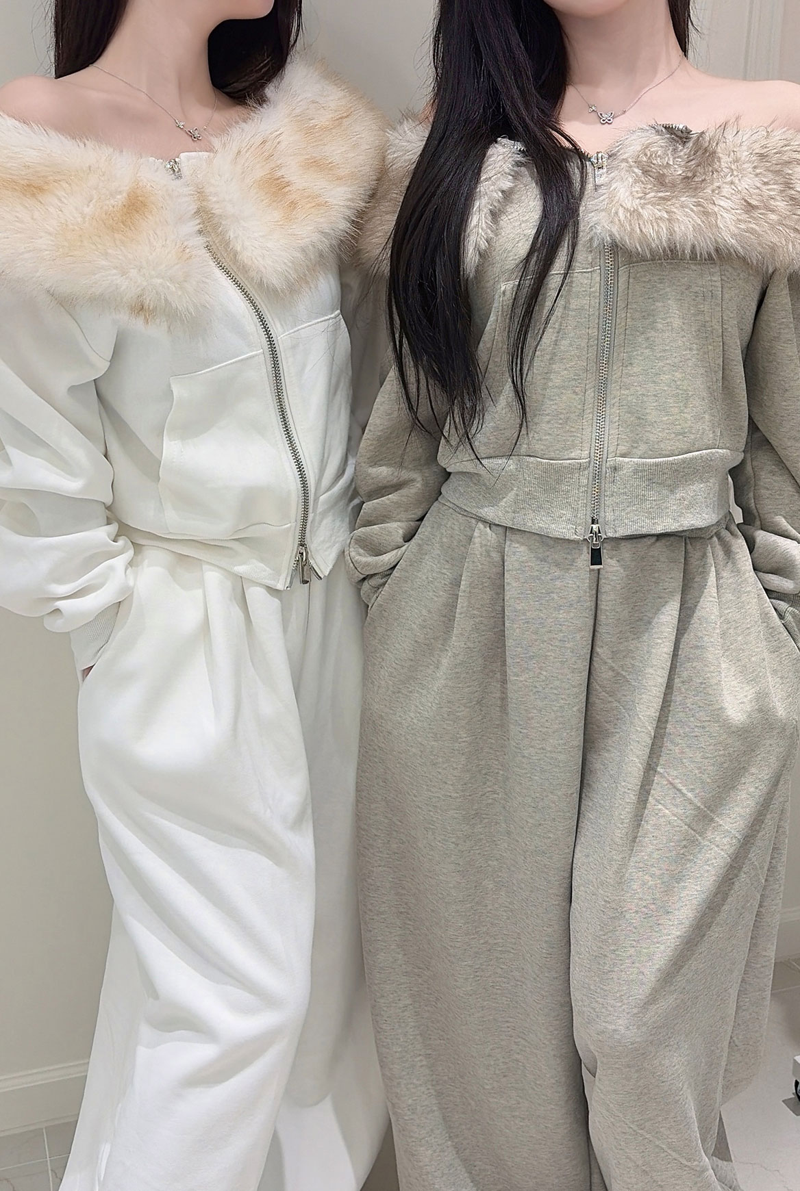 - 퍼 디테일이 목선을 감싸며, 오프숄더 또는 브이넥 두가지 연출 가능한 만능 집업세트 - 하의는 루즈한 와이드 핏으로 떨어져 고급스러운 무드완성! - 보온성과 착용감 모두 우수해 가을,겨울 시즌에도 포근하게 착용 가능!